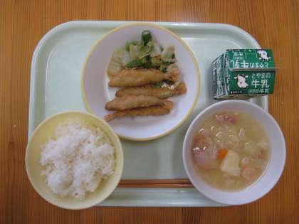 今日の給食は、ごはん、わかさぎのフリッター、グリーンアスパラのごまだれ、野菜のスープ煮です。
