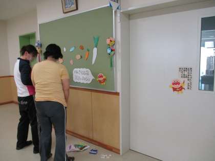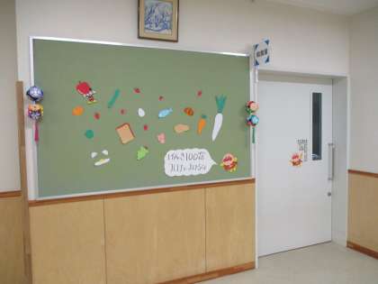 給食室前の掲示板を調理員さんたちがコロナに負けないように飾りを貼ってくださいました。登校して見る日を楽しみにしていてくださいね。