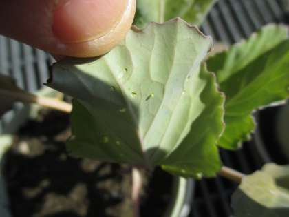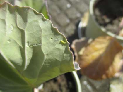 5月7日(木)、キャベツの葉のうらをみると、ある生き物の「たまご」と「よう虫」がいました。いったい、何の生き物なのでしょうか?