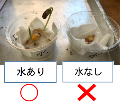 この実験から発芽するには、水、適当な温度、空気の3つすべてが必要ということですね。