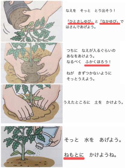 なえのうえ方は教科書のP18にあります。おうちの人といっしょにやってみましょう。