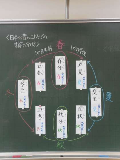 最後に、豆知識。クイズを解いてみて、2月なのに「立春」など、実際の季節感と合わないものがありますね。これは、3枚目の写真にあるように、昔のこよみは例えば、春は「春分の日」を中心にその前後3か月をいっていたそうです。そのために春分の日の1か月半前の2月3日が、まだまだ寒いのに「立春」(春のはじまり)の日になってます。くわしくは、写真の3枚目を見て理解してください、。いろいろな季節の言葉を知り、四季を楽しんでいきましょう。