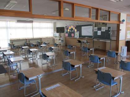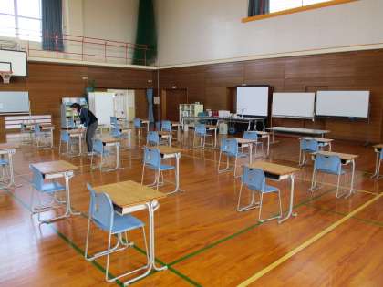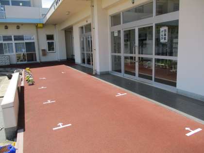 5月25日(月)から当面の間、密の状態を避けるため玄関、使用教室を学年ごとに変更しました。玄関は印を付けて、子供たちが距離をとりながらスムーズに校舎に入れるようにしました。また、使用教室を変更したり、机と机の距離をとるようにしました。