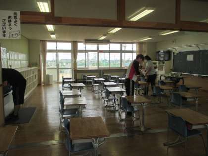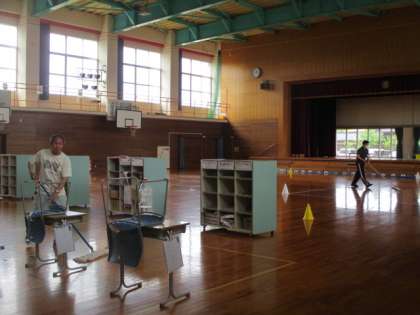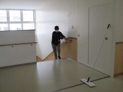 子供たちの下校後は、教室、廊下、階段、玄関等の消毒作業に全職員で取り組んでいます。