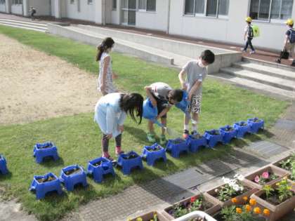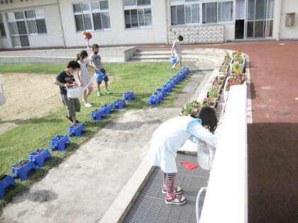 3年生は、大成っ子ガーデンの水やりや玄関先の鉢にヒマワリ、ピーマン、オクラ等に水をやっています。