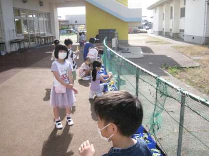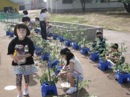 教室(ランチルーム)で授業の準備や大成っ子広場でプチトマトに水やりをしています。