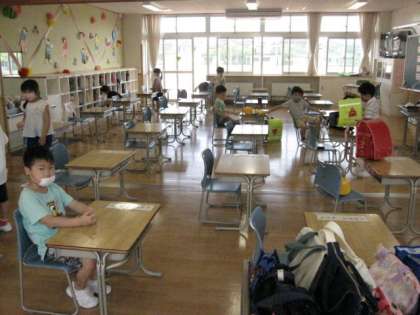 1年生の朝の活動と朝の玄関の様子