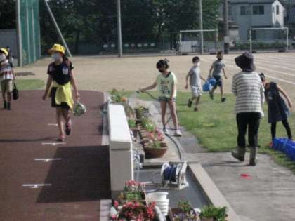 玄関先では、6年の環境委員が水やり(3年生の横で)をしています。