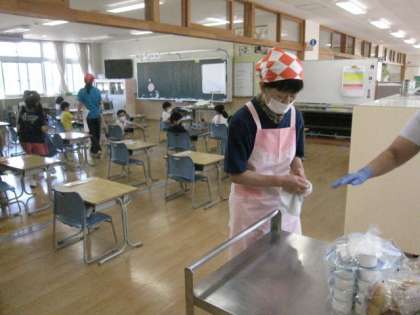 初めての給食が、簡易給食で始まりました。初日は、ロールパン、こくとう蒸しパン、魚肉ソーセージ、ヨーグルト、牛乳でした。いかがでしたか?初めてなので、担任の土肥先生や調理員(塩田さん、井上さん)、加藤先生、助田先生も手伝いました。皆さん静かに、上手に待つことができました。明日も楽しみですね。