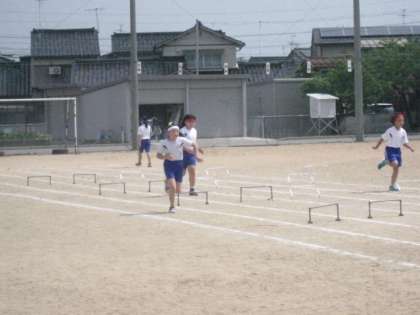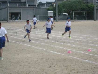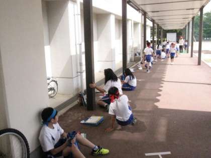 ミニハードルを置き、リズミカルに走る練習をしました。暑かったので、適宜休憩を日陰で取り、水分補給を行っています。