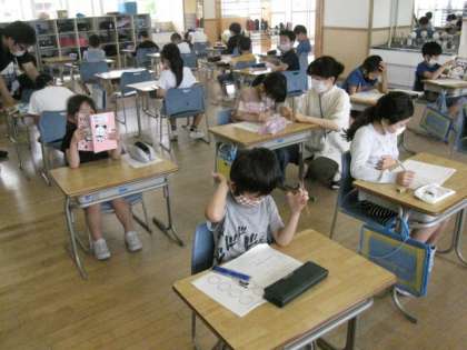 「時こくと時間のもとめ方」のミニテストを行いました。その後、先生からの解説を聞き、理解を深めました。スクールサポーターの入部先生も一緒に学習しました。難しかったかな?
