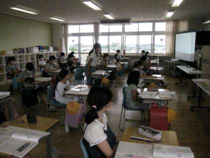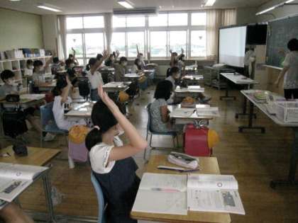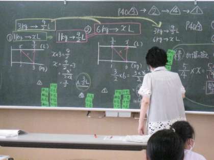 分数のかけ算の問題を解いていました。先生の「どんな情報が必要ですか?」「それはなぜですか?」の問いに、児童たちは挙手し、自分の考えを発表しました。先生は、ひとこと「完璧です。」