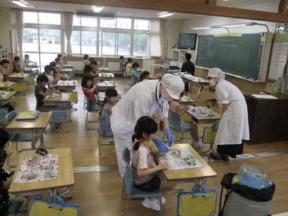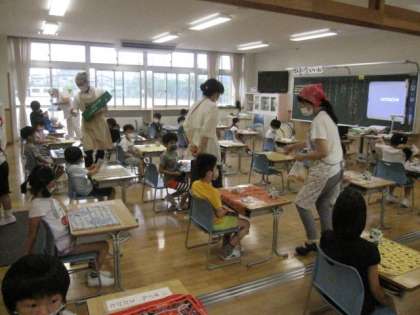 給食準備は、先生や調理員等がお世話をしています。パンやチーズかまぼこの包装を開けることが難しいようですね。