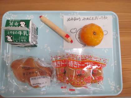 今日の献立は、ロールパン、牛乳、チーズかまぼこ、豆乳ドーナツ、冷凍みかんです。