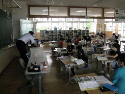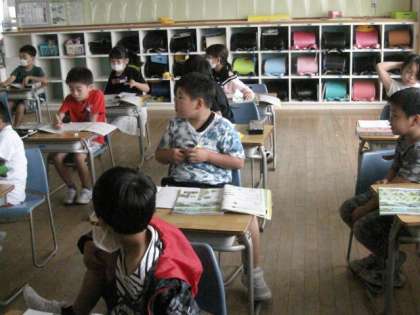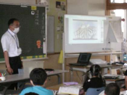 映像を見ながら、先生が「モンシロチョウの成長の様子は?」の質問に児童は