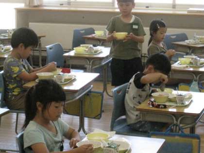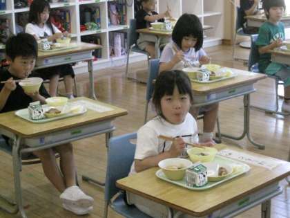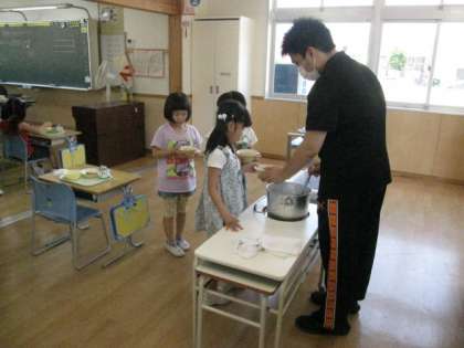 お代わり欲しい人は、前に出てください。たくさん食べてね! 給食、最高!