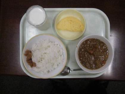 今日の献立は、ごはん、牛乳、キーマカレー、オムレツです。
