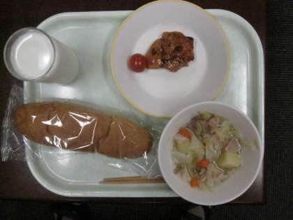 今日の献立は、黒糖コッペパン、牛乳、とり肉のバーベキュー味、ミニトマト、野菜のスープ煮です。