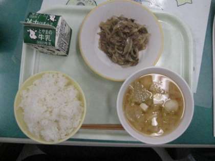 今日の献立は、ごはん、牛乳、プルコギ、つみれ汁です。