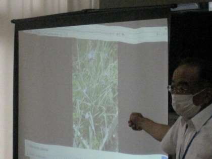 「ムラサキツユクサが一番、調べるのに適しています。たんぼ道に咲いています。見たことはありますか?」との先生の問いに、児童は「登下校の道は、アスファルトばかりだから・・・・」