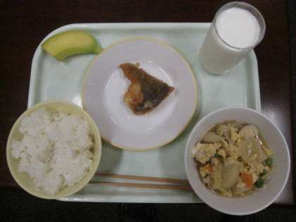 今日の献立は、ごはん、牛乳、あげざかなのレモン味、親子煮、バナナです。
