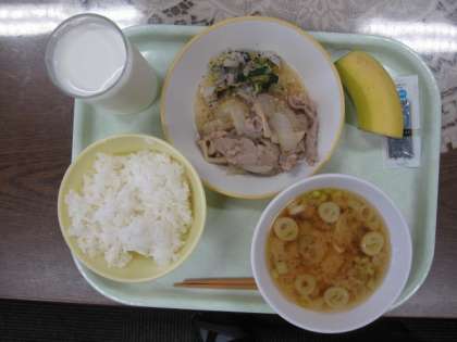 今日の献立は、ごはん、牛乳、豚肉のおろし炒め、ゆかりあえ、じゃがいものみそ汁、バナナ、のりの佃煮です。