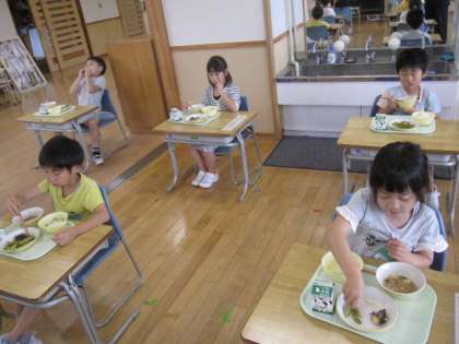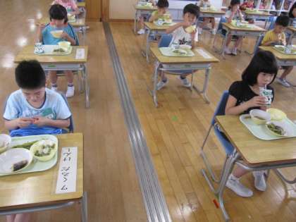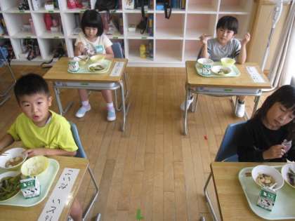 今日は、枝豆が人気でした。豆ごはんにする児童も。 みんなおいしそうに食べていました。