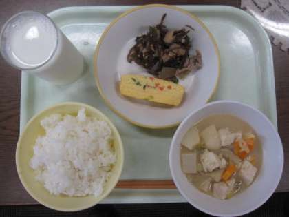 今日の献立は、ごはん、牛乳、ちぐさやき、もずくのチャプチェ、ごまけんちんです。