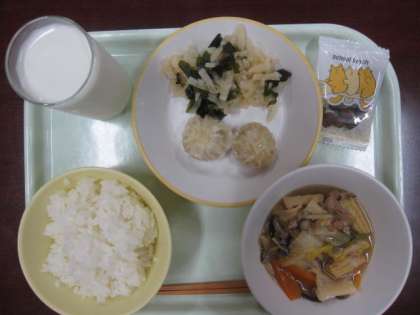 今日の献立は、ごはん、牛乳、ショウロンポウ、わかめと大根のナムル、八宝菜、黒糖大豆です。