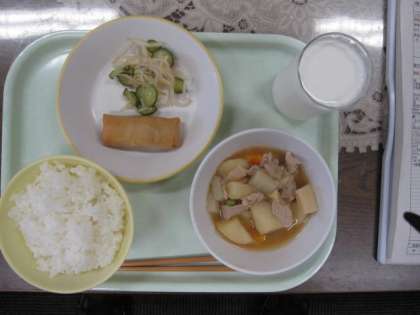 今日の献立は、ごはん、牛乳、春巻き、切り干し大根のサラダ、南蛮煮です。
