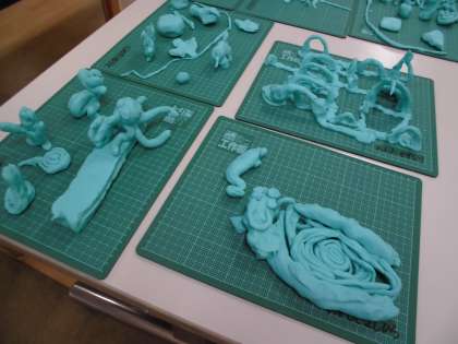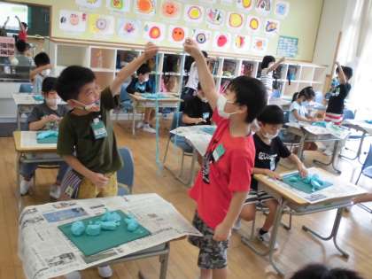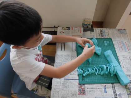 今日の図画工作は、粘土を使いました。長くした粘土のひもを重ねたりつないだりしてました。つくりながら想像が広がり、楽しい作品がたくさん仕上がりました。