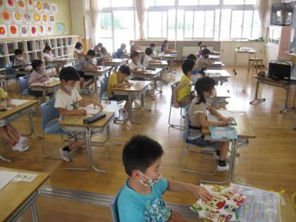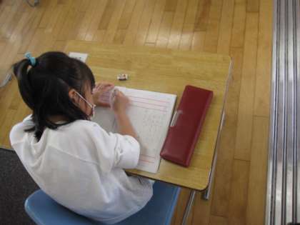 先生は実物投影機を使って、児童に分かりやすく説明しています。