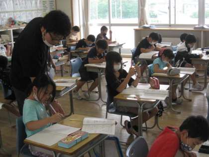 先生は、机間指導で書き方の指導もしています。