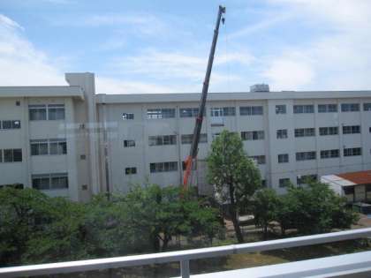 隣の中学校の工事です。非常階段を取り替えています。工事車両が、学校の敷地に入ります。気をつけて!