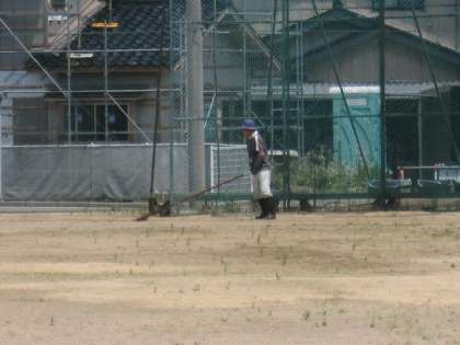 三浦さんが、グランドの整備です。ご苦労様です。誰かお手伝いしてくれないかな?