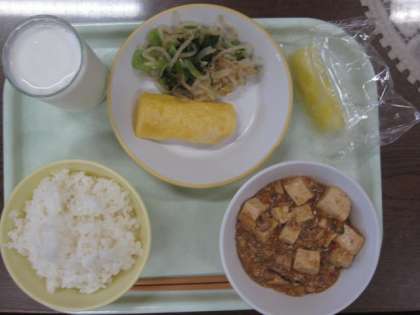 今日の献立は、ごはん、牛乳、卵ロール、チンゲンサイびたし、マーボー豆腐、冷凍パインです。