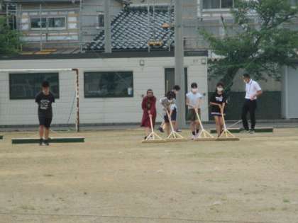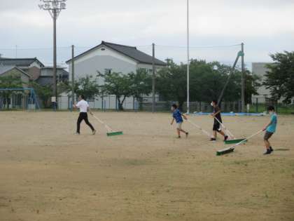 雨の日が続き、土が固まったり、草が生えたりして、グラウンドの状態が悪くなってきました。今朝は、環境委員会の5・6年生が進んでグラウンド整備に出ていました。蒸し暑い中、一生懸命ブラシをかけてくれました。みんなのために働く大成っ子です。