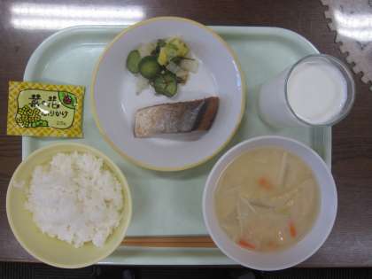 今日の献立は、ごはん、牛乳、ふくらぎの照り焼き、昆布あえ、呉汁、菜の花ふりかけです。