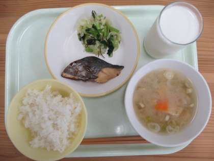 今日の献立は、ごはん、牛乳、鰆の幽庵焼き、昆布あえ、みそ汁です。今日は、昆布あえに入っている昆布のお話をします。富山県の人は、昆布をよく食べることで有名ですね。富山では昆布を汁物や麺類の出汁として使うだけでなく、昆布じめや昆布巻きにしたり、昆布を薄く削ったとろろ昆布をおにぎりやうどん、すまし汁などに入れたりして食べます。昆布は、カルシウムや鉄、食物繊維など不足しやすい栄養素が含まれています。残さず食べて強い体を作りましょう。
