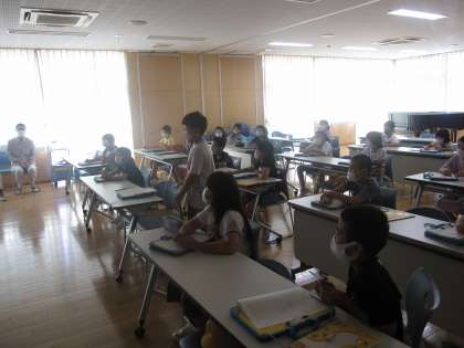 車の黄色は「土」、青は「空」を表していることや1台に700軒分のゴミを集めることができることなどを学びました。最後は、講師の先生に質問攻めで、子どもたちの好奇心はずいぶん満たされたようです。