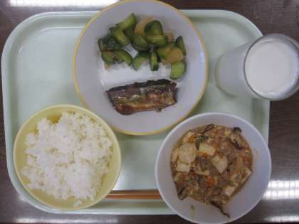 今日の献立は、ごはん、牛乳、さんまの土佐煮、華風和え、マーボー豆腐です。