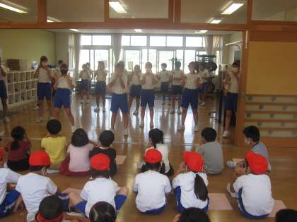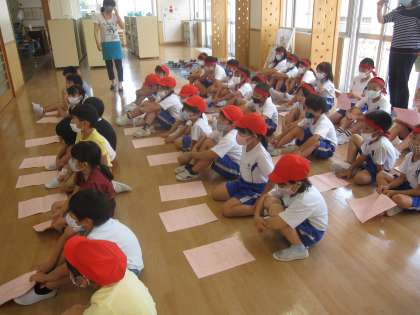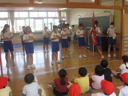 運動会結団式がありました。赤団は1階オープンスペースで行いました。団役員や5〜6年生の団リーダーから、いきごみや応援歌や流れを教えてもらいました。みんな気持ちを一つに大きな声で言ったり、教えてもらった振り付けを行っていました。