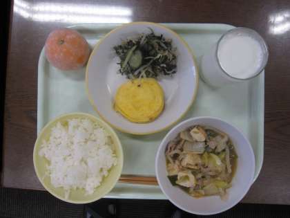 今日の献立は、ごはん、牛乳、かにたま、いそあえ、韓国風すきやき、冷凍みかんです。今日は、韓国風すき焼きに入っている豆腐のお話をします。豆腐は、中国発祥の食べ物で、日本には奈良時代に伝えられたそうです。みなさんは、豆腐が何からできているか知っていますか?豆腐は大豆から作られています。大豆には血や肉を作るたんぱく質が多く含まれていますが、大豆のままで食べると消化がよくありません。豆腐にすることで消化がよくなります。昔は、肉や魚を食べないお坊さんたちの大切なたんぱく源でした。給食でも、豆腐はいろいろな料理に使われていますね。残さず食べて強い体を作りましょう。