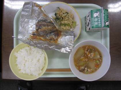 今日の献立は、ごはん、牛乳、さんまの銀紙やき、はりはりあえ、冬瓜のそぼろあんです。