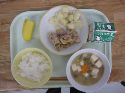 今日の献立は、ごはん、牛乳、あっさりチキン、こふきいも、なめこ汁、バナナです。