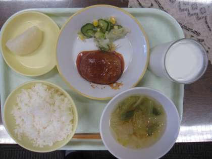 今日の献立は、ごはん、牛乳、ハンバーグのマスタードソース煮、コーンサラダ、レタススープ、梨です。