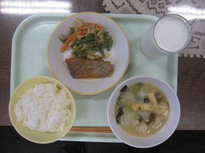 今日の献立は、ごはん、牛乳、、揚げ魚のレモン味、いんげんのごまあえ、味噌汁です。