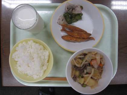 今日の献立は、ごはん、牛乳、わかさぎのフリッター、ばいにくあえ、肉じゃがです。