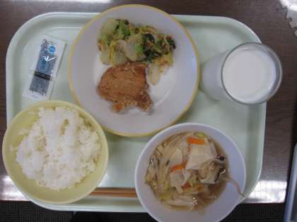 今日の献立は、ごはん、牛乳、豚肉のたつたあげ、いりだいずあえ、ワンタンスープ、のりのつくだ煮です。
