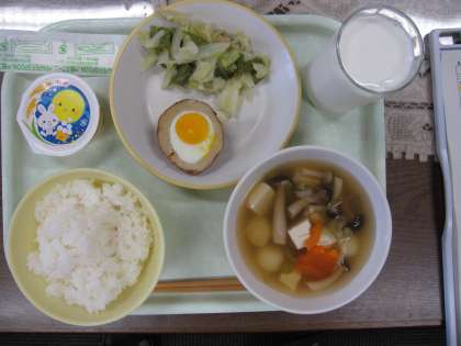 今日の献立は、ごはん、牛乳、スコッチエッグ、アスパラソテー、白玉汁、月見ゼリーです。